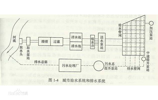給水工程為居民和廠、礦、運(yùn)輸企業(yè)供應(yīng)生活、生產(chǎn)用水的工程以及消防用水、道路綠化用水等。由給水水源、取水構(gòu)筑物、原水管道、給水處理廠和給水管網(wǎng)組成,具有取集和輸送原水、改善水質(zhì)的作用。① 給水水源有地表水、地下水和再用水。②取水構(gòu)筑物有地表水取水構(gòu)筑物和地下水取水。